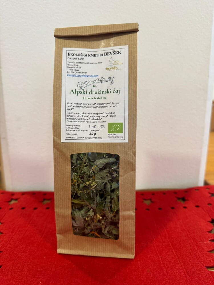 Bio alpski družinski čaj je skrbno izbrana mešanica ekološko pridelanih alpskih zelišč, ki ponujajo prijeten, blag in naravno aromatičen okus. V njem se prepletajo nežne note mete, melise, materine dušice in drugih tradicionalnih alpskih rastlin, ki so že stoletja cenjene zaradi svoje blage, pomirjujoče in vsakomur prijazne narave.